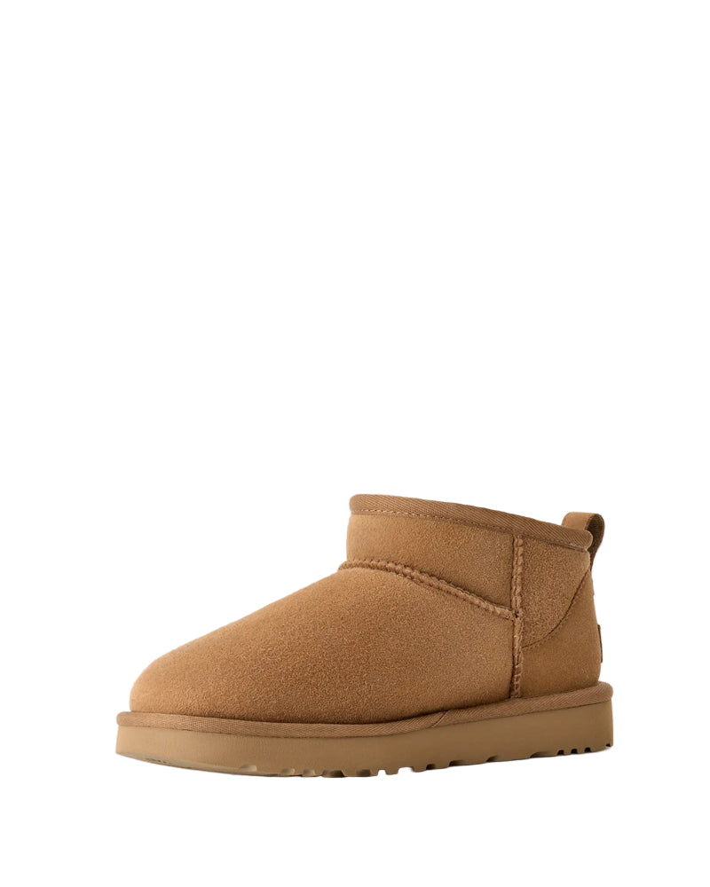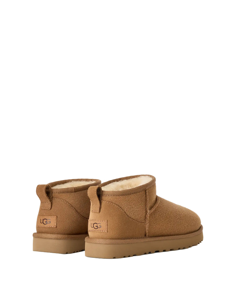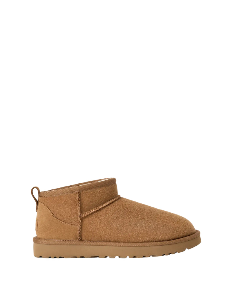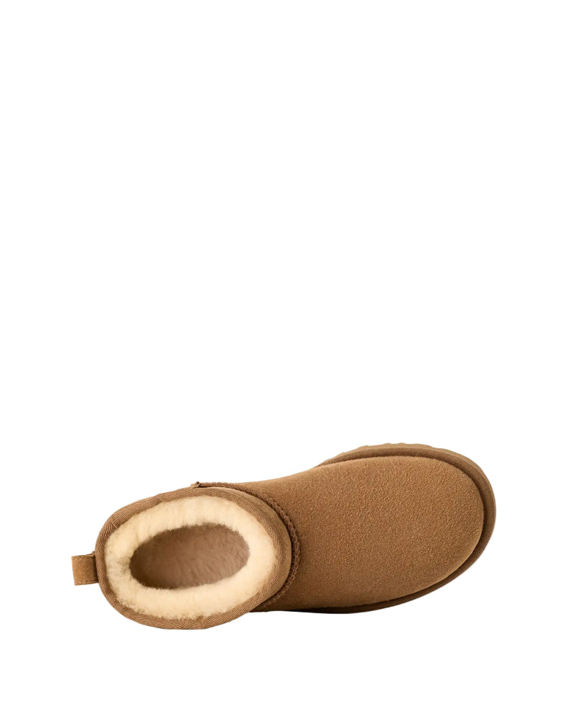 Classic Ultra Mini Coloris: chestnut Composition: cuir suédé, semelle intérieure 80 % laine recyclée, 20 % lyocell Dimensions: Hauteur de la tige : 9 cm Tige en cuir suédé / coutures en surjet / tirant à l’arrière / bracelet asymétrique