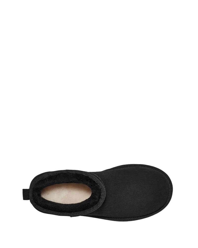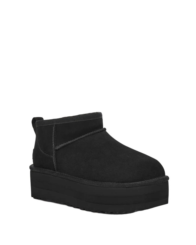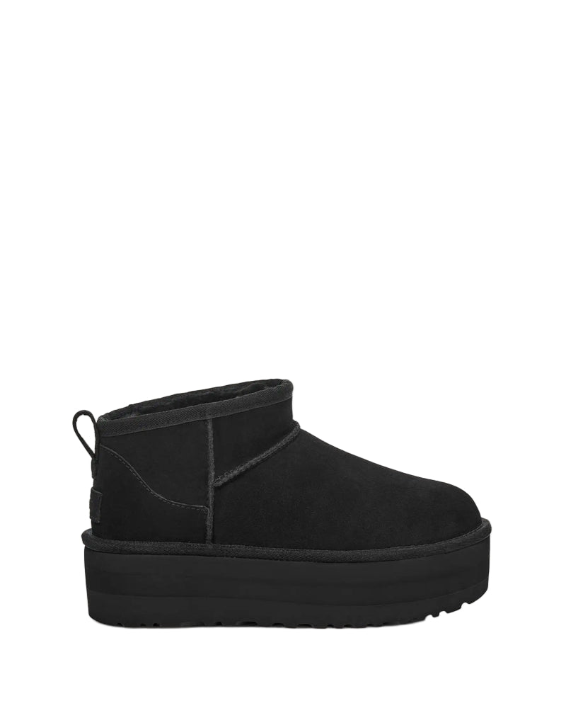 Boots Ultra Mini Coloris: noir Composition: cuir suédé, semelle intérieure 80 % laine recyclée, 20 % lyocell Dimensions: Hauteur de la tige : 9 cm / Plateforme de 5 cm Tige en cuir suédé / coutures en surjet / tirant à l’arrière / bracelet asymétrique